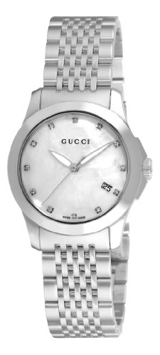 Stainless steel case with a steel link bracelet. Fixed stainless steel bezel. Mother of pearl dial with luminous silver-tone hands and diamond hour markers. Date display at the 4 o'clock position. Quartz movement. Scratch resistant mineral crystal. Textured steel crown. Stainless steel case back. Case diameter: 27 mm. Case thickness: 7 mm. Push button deployment clasp. Water resistant at 30 meters / 165 feet. Gucci G Timeless Ladies Watch YA126504.Gucci Women's YA126504 Gucci Timeless Watch Specifications